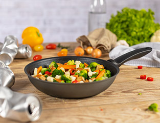 Die neue New Life Bratpfanne besteht aus 100 % Recycling-Aluminium aus Europa und wird mit bis zu 95 % weniger Energie als herkömmliche Alu-Pfannen hergestellt. Für die Herstellung einer Pfanne wird Aluminium unter anderem von rund 30 Dosen recycelt. Es lohnt sich also, Alu-Dosen zu sammeln...